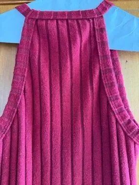 A sleek sleeveless ribbed maxi dress in rich burgundy. Soft, stretch knit fabric flatters the silhouette. High neckline and long length create a modern, elegant look. Perfect for daytime or evening styling.