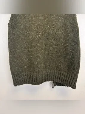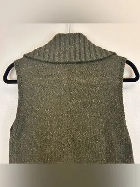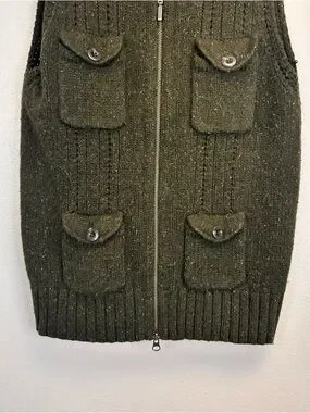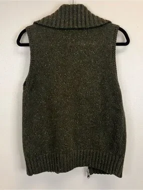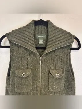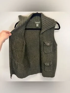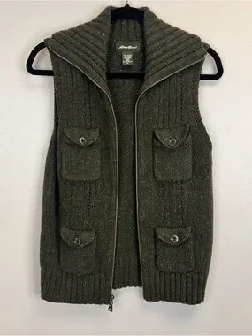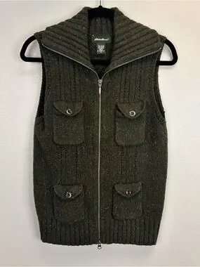Eddie Bauer dark green knit vest size M. Sleeveless knit vest with full front zipper. Four button-flap front pockets. Wide ribbed collar and hem. Soft, textured wool-blend fabric.