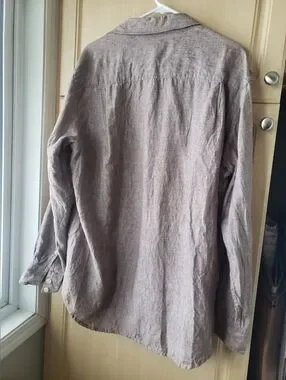Lightweight linen button-up shirt. Soft taupe color with natural texture. Classic collar and front pocket. Neutral versatile style. Easy to layer.