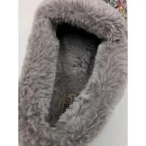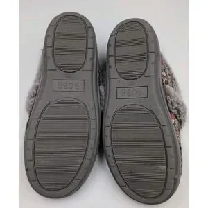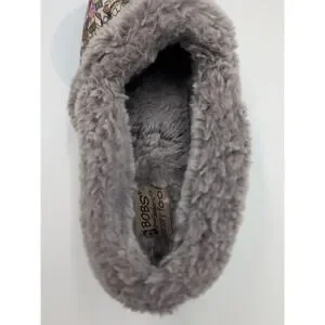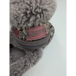 The Skechers BOBS Slippers in women's size 7.5 feature a cute dog print design with faux fur lining for cozy comfort. These slip-on slippers have a round toe, flat heel, and rubber outsole for durability. The memory foam feature provides added comfort and support, making them perfect for casual wear. This adorable and stylish slipper is part of the Skechers BOBS line, combining practicality with a playful animal-themed design.
