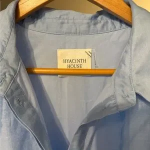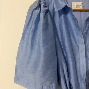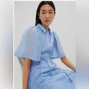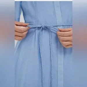 A pale blue midi shirt dress with a button-front and puff short sleeves. Features a braided tie waist for a defined silhouette and soft flowing skirt for easy movement. Lightweight, breathable fabric ideal for daytime events and casual wear.