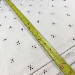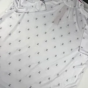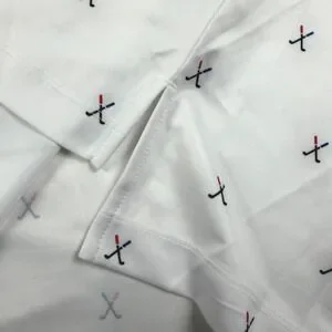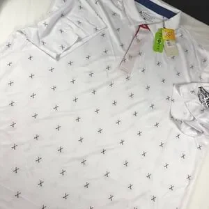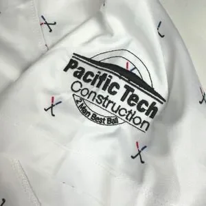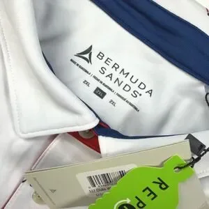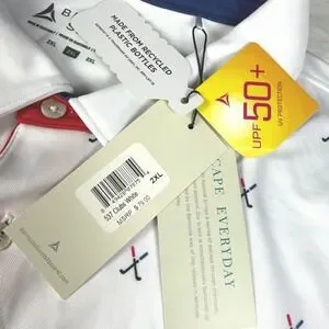 Bermuda Sands short sleeve golf polo features a crisp white fabric with an all-over golf club print in red and blue. This performance shirt includes a Pacific Tech Construction 2 Man Best Ball embroidered logo on the left sleeve and is crafted from Repreve recycled plastic bottles. Designed for the course, it offers UPF 50+ sun protection to keep you safe during long rounds. The shirt is finished with a three-button placket, a contrasting blue inner collar, and side vents at the hem. This item is in new with tags (NWT) condition.