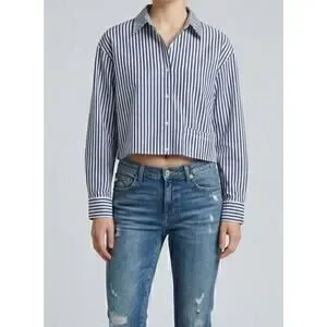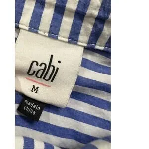 Discover this delightful CAbi M 6085 striped blue and white prep school button-down shirt, perfect for adding a touch of classic charm to your wardrobe, and presented in excellent pre-owned condition with no stains, tears, or flaws.