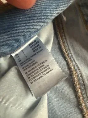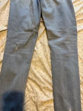 Light blue denim mom jeans with distressing. Leather brand patch at the waist. Classic casual wardrobe staple. There is a tear in one of the belt buckles so it is not connected.