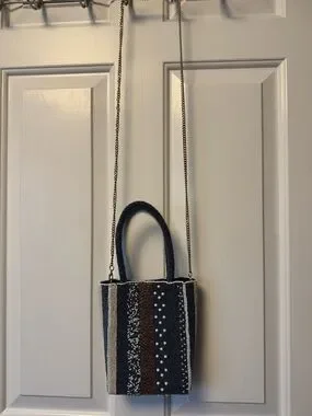 New, never used. Hand-beaded mini tote with vertical stripe pattern. Dual beaded top handles and a removable chain strap. Textured beadwork and pearl-like accents create visual interest.