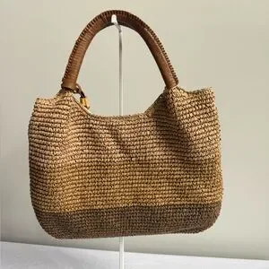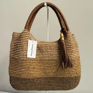 Tommy Bahama woven straw shoulder tote with leather-look handles. Tassel accent adds a stylish touch. Open-top design for easy access. Lightweight and casual for everyday wear.