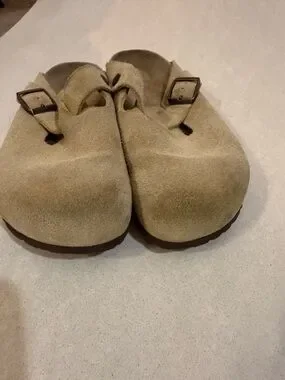 Soft suede upper with a single adjustable buckle. Cushioned contoured footbed for comfort m. Easy slip-on design for quick wear. Neutral tan hue pairs with many outfits. Men size 8. Women size 10