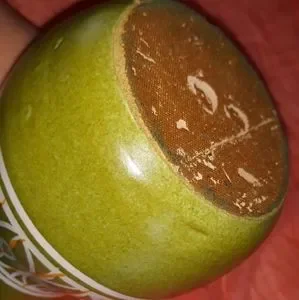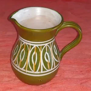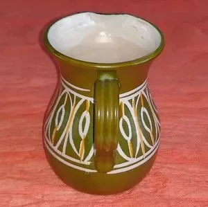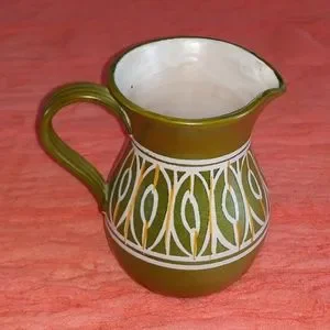 Enjoy this Mid Century Modern avocado green pottery pitcher with a striking white and yellow design in your home. There are smooth surfaces in most areas, but there are imperfections throughout including some rough texture under the handle, please review closeup pics.