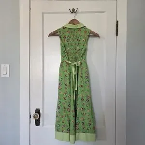 This vintage sundress by April Cornell is for the little girl with an old soul and a whimsical heart. Made of 100% cotton, it features delicate pansies against an apple green background; it has gingham green accents, and the collar is embroidered with more tiny pansies. It’s sleeveless, with covered buttons down the front and waist-ties that come together in a sweet bow at the back. This is a timeless piece that you’ll treasure for years to come.