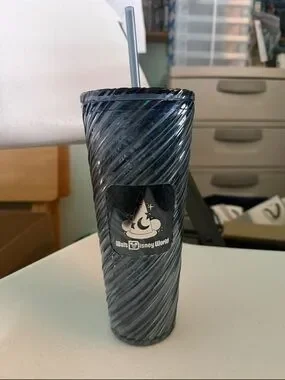Starbucks reusable tumbler with twist swirl texture. Iridescent black finish shows subtle color shifts. Includes matching straw and screw-on lid. Features Walt Disney World logo on front. Dishwasher-safe design for daily use. Never used !