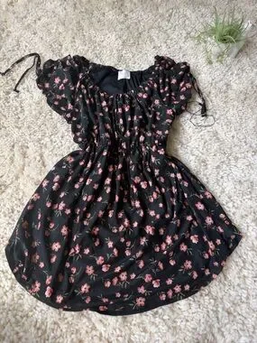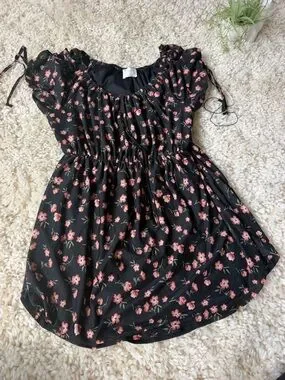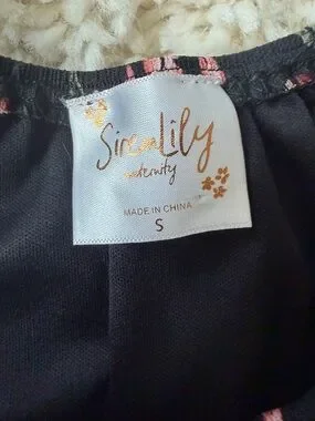 Lightweight peasant-style Siren Lily Black Floral Peasant Blouse with Pink Flowers. Black base with scattered pink floral print. Elasticized waist and neckline. Short flutter sleeves with tie details. Soft, flowy fabric for everyday wear. Small.