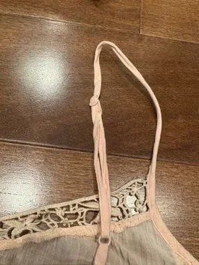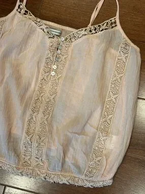 Pale pink camisole with lace trim and button-front detail. Adjustable spaghetti straps. Lightweight, breezy fabric ideal for layering. Feminine silhouette with decorative vertical lace panels.