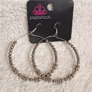 Antiqued silver accents and textured silver beads are threaded along a silver wire that is curved into a front-facing hoop creating a down-to-earth charm. Earring attaches to a standard fishhook fitting.