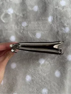 Compact Coach card case with attached keyring. Cream exterior with blue tie-dye accents and brown ID window. Features silver-tone hardware and visible stitching. Lightweight and easy to carry.