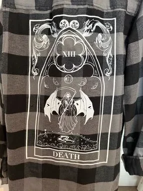 Casual black and gray plaid women's flannel with bold Death tarot graphic on back. Soft, breathable fabric for comfortable everyday wear. Button-front design for easy layering and a relaxed fit. Features a striking monochrome graphic for a modern, edgy look. Used twice.