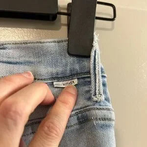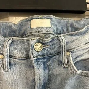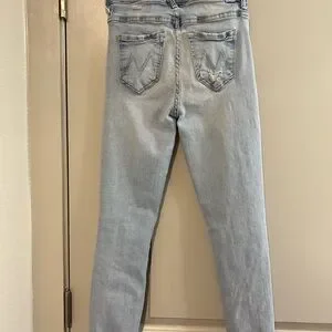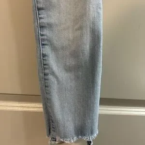 Stylish ankle-length jeans. Light blue wash. Distressed detail on knee. Frayed hem for a trendy look.