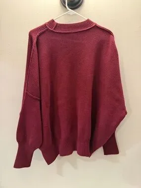 Free People Ottoman Slouchy Tunic sweater in a rich berry red/burgundy hue. This iconic oversized pullover features a heavy ribbed knit texture, a classic mock neck, and dramatic dolman sleeves for a relaxed, bohemian silhouette. Designed with a high-low hem and side slits, it offers a versatile fit that pairs perfectly with leggings or skinny jeans. The thick, structured fabric ensures a cozy feel while maintaining its signature architectural shape.