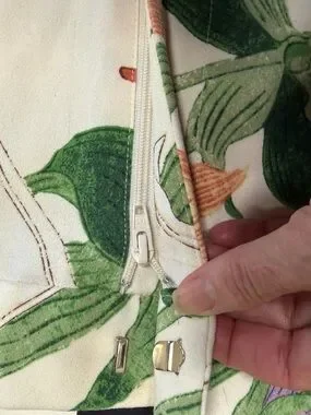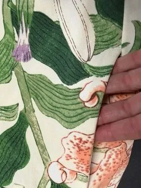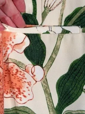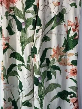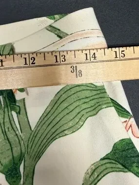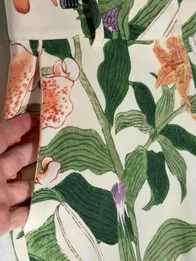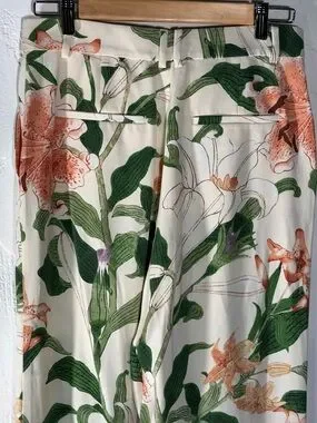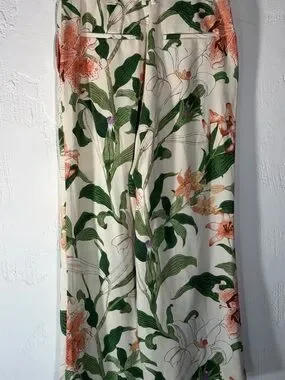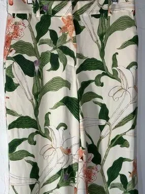 Cropped wide-leg pants with an all-over botanical print. Cream base with lush green leaves and soft peach floral accents. High-rise waist and relaxed silhouette. Easy-to-style piece for spring and summer outfits.