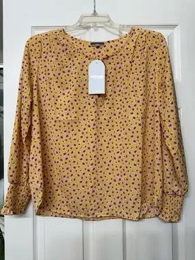 Pleione Yellow Floral Long-Sleeve Blouse with Smocked Cuffs