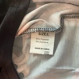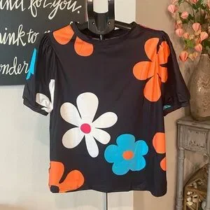 This tee has a black background with a large vibrant flower print. Fabric is soft & has stretch in it.