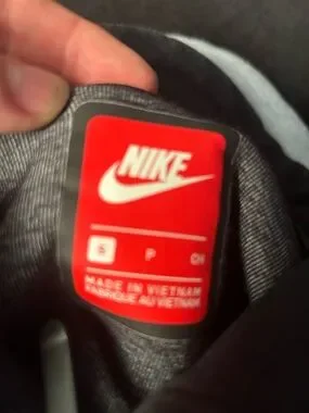 Classic Nike zip-up hoodie in light gray with black accents. Hood with drawstrings and a full front zipper. Black Nike swoosh and chevron stripe detail. Casual sporty style.