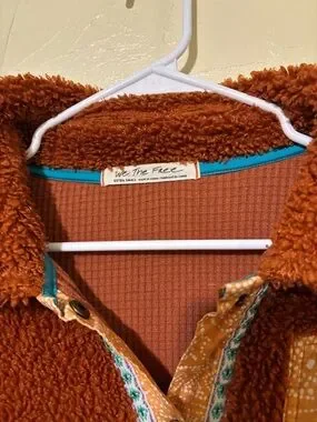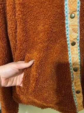 Cozy sherpa jacket in rich rust with patterned trim. Snap-front closure with decorative banding. Relaxed silhouette for easy layering. Plush, warm texture.