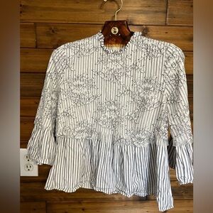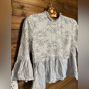 Zara Woman Striped Lace Floral Sheer Layer Size medium blouse top black white