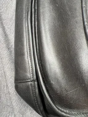 Classic Coach messenger in smooth black leather. Front flap with brass-tone turn-lock closure. Adjustable shoulder strap with brass-tone buckle. Clean, versatile silhouette for everyday use.