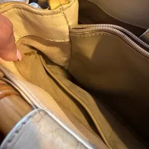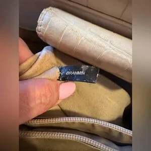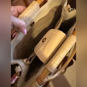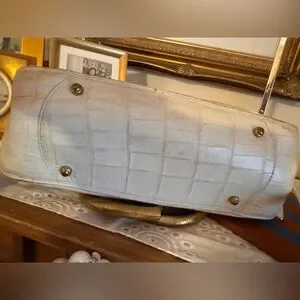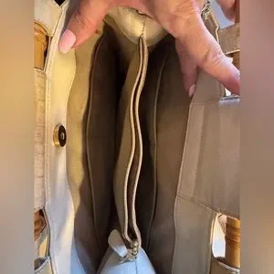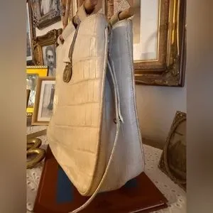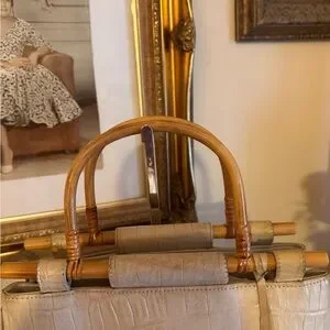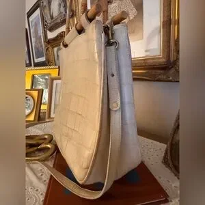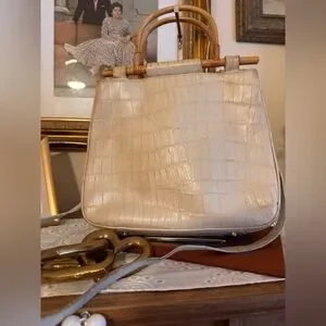 This vintage Brahmin Cecelia handbag features a unique framed bamboo handle and is the perfect addition to any fashion-forward woman's collection. The exterior is made of high-quality leather in a beautiful ivory color, and the satchel/top handle style is both practical and stylish. The bag is branded with the signature Brahmin logo, adding to its authenticity.
