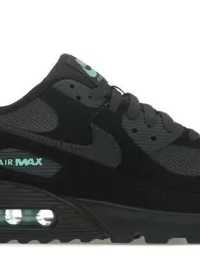 Classic Nike Air Max 90 size 9.5 in black with teal highlights. Visible air cushioning for responsive comfort. Padded collar and tongue for support. Durable tread for everyday traction. Clean, sporty look for casual wear.