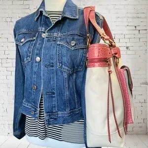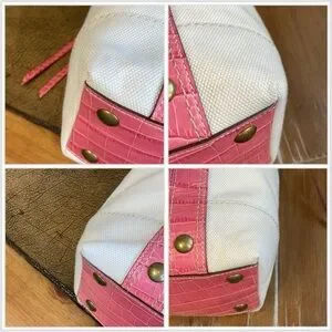 A true gem from Coach’s coveted 2007 Legacy Collection, this slim tote blends timeless elegance with playful edge. The body features textured ivory canvas framed in vibrant pink croc-embossed leather trim—an eye-catching contrast that feels both classic and bold. Signature brass hardware adds warmth, while the original medallion and metallic embossed hangtags nod to its heritage.