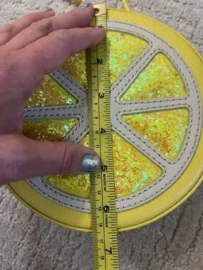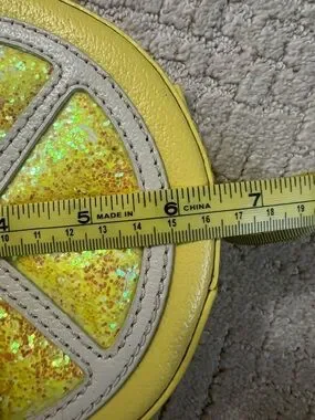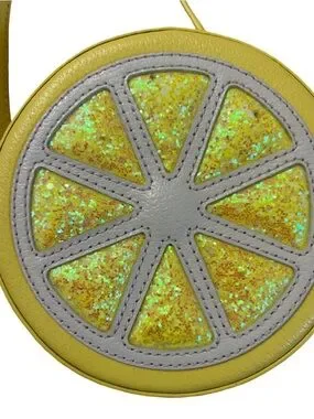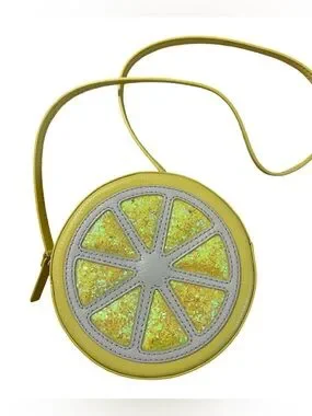 Kate Spade New York Lemon Street Crossbody Bag. It is a novelty, fruit-shaped purse featuring a circular "lemon slice" design with sparkly, glitter-filled segments and a yellow leather-like exterior.