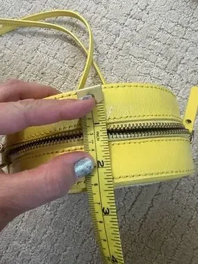 A round crossbody bag mimicking a lemon slice, often part of the "Picnic Perfect" or "Lemon Street" collections.It includes a zip-around closure and a long shoulder/crossbody strap, which is a mix of chain and leather. Measurements in photos. Excellent condition.