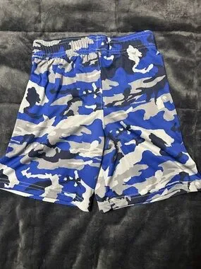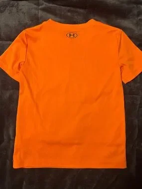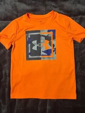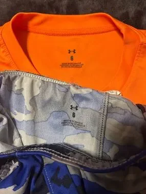 Under Armour short sleeve athletic tee in bright orange with bold logo graphic. Coordinating blue and gray camo performance shorts with small orange logo. Breathable fabric for active wear.