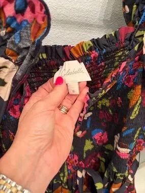 Black sundress with a colorful floral print. Smocked bodice and adjustable straps. Bright pink and blue floral accents with green foliage. Easy, feminine silhouette for warm days.