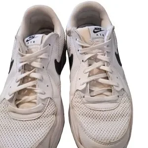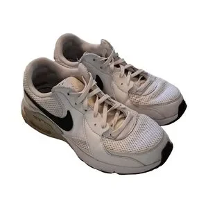 Lightweight running shoes with breathable white mesh. Black Nike Swoosh on the sides. Cushioned Air Max sole for shock absorption. Padded collar for comfort. Classic athletic silhouette. See photos for details and condition.
