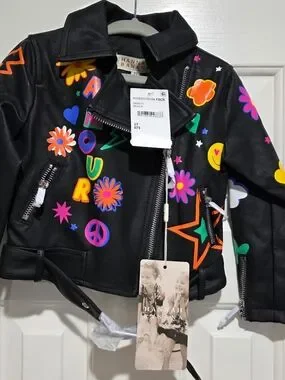 Bold nwt hannah banana faux leather moto jacket. Bright multicolor floral, star, peace and smiley graphics. Zipper front with decorative pockets. Playful and fashionable kids' outerwear. 2T.