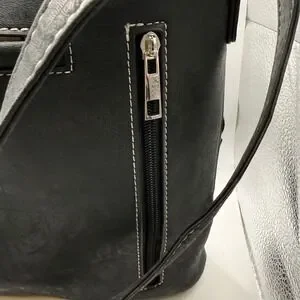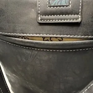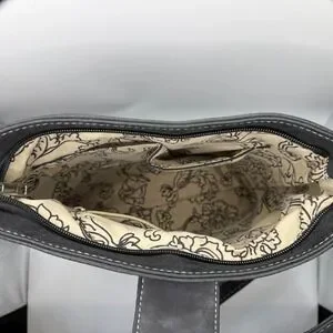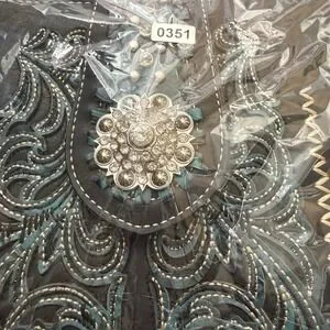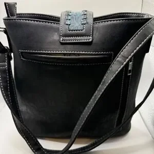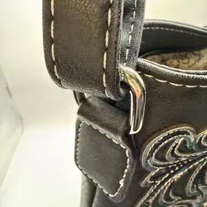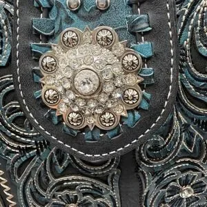 Western-inspired crossbody bucket bag crafted in a black faux leather with intricate teal floral embroidery and silver-tone stud accents. This statement piece features a large central crystal-encrusted concho on the magnetic flap closure and contrast white topstitching throughout. The interior is lined with a decorative paisley fabric and includes multiple organizational pockets, while the exterior offers a convenient back slip pocket and a side vertical zipper pocket for quick access. Finished with an adjustable shoulder strap and a structured base for a classic cowgirl aesthetic.