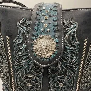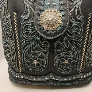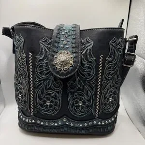 Western Embroidered Crossbody Bucket Bag Black Teal Floral Studded Concho Boho