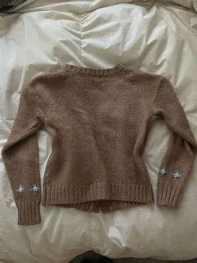 Brown cable-knit V-neck sweater with delicate rose embroidery. Comfortable, cozy knit designed for everyday wear. Features ribbed trim and subtle embroidered accents on chest and sleeves. A versatile brown sweater that pairs easily with casual or layered looks.