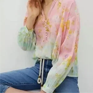Oversized fits like a medium. Soft pink blouse with pastel gradient and delicate floral print. Lightweight feel and relaxed silhouette. Button-front placket and gathered long sleeves. Feminine, easy styling for everyday wear.