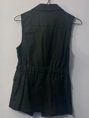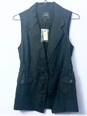 Sleeveless tailored vest in black linen. Single-button front with notch lapel. Flap pockets and defined waist seam. Lightweight layering piece for polished looks.