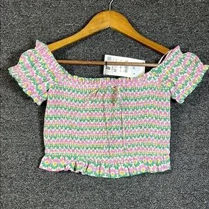 Zara has Green and Pink Smocked Flutter Sleeve Crop Blouse, Womens M