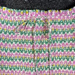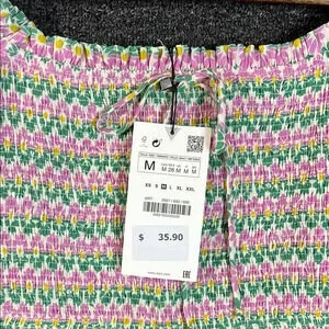 This stylish Zara blouse showcases a smocked bodice with flutter sleeves, exuding a playful charm. The vibrant green and pink colors enhance its lively appeal, while the ruffled hem adds a touch of elegance. Ideal for warm weather, this top combines comfort with a chic design.