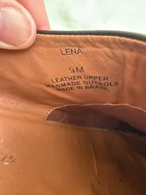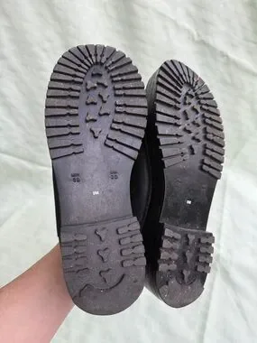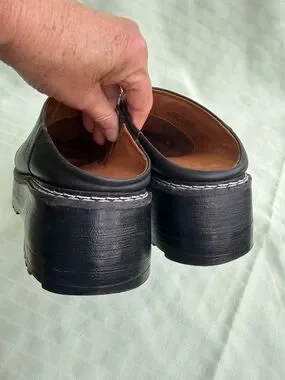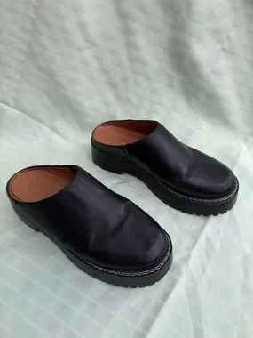Sleek black leather slip-on clogs by Matisse. Thick lug sole for traction and durability. Smooth leather upper with simple, modern silhouette. Brown-tan interior lining for contrast. Length from toe to heel is 9.8”. Says size 9, feels more like 8.5. Heel height is 2”. Platform 1”.