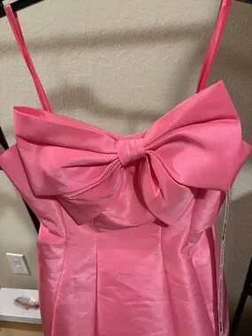 Vibrant pink mini dress with a large bow at the bust. Removable Spaghetti straps and a structured tulle silhouette. Feminine and eye-catching. Great for parties and events.