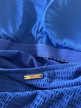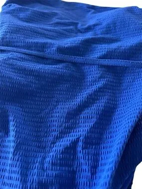 Sleek one-shoulder one-piece swimsuit. Textured fabric with a side tie at the waist. Bold cobalt blue color. Clean, minimalist silhouette.