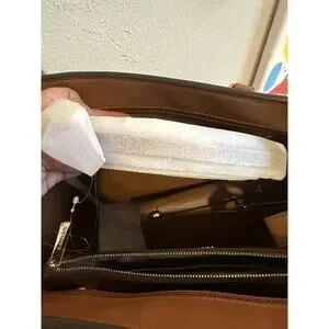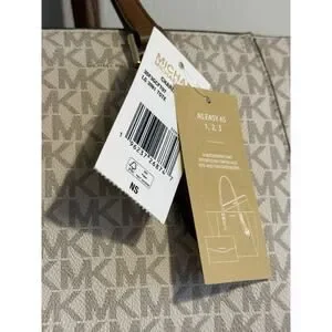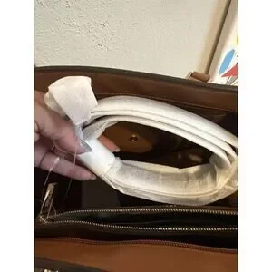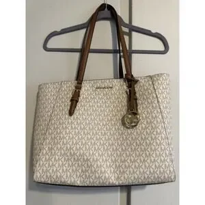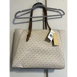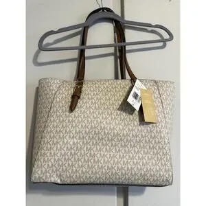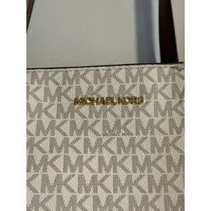 The Michael Kors Charlotte Large 3-in-1 Tote Shoulder Bag + Clutch in Vanilla/Brown is a versatile and stylish handbag designed for various occasions such as travel, weddings, parties, casual outings, and workwear. Made with satin fabric and leather, this rectangular shaped bag features a zip closure, gold-toned hardware accents, and a signature/solid pattern. It includes adjustable straps, pockets, a cross-body strap, and is stain-resistant and water-resistant. The bag is finished with coated material and comes with a brand card as an accessory. With its designer theme and high-quality construction, this tote bag from the Michael Kors Charlotte product line is a chic and practical choice for any fashion-forward woman.