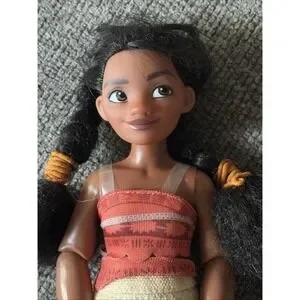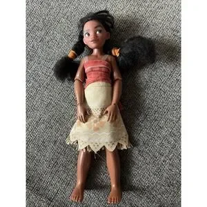The Disney store Princess Moana classic toy doll figure is an 11" articulated doll with dark brown curly hair and a medium dark complexion. This girl doll from the Moana franchise, manufactured in 2018, is part of the Disney Princess product line. It is an original piece made of plastic and comes in its original packaging. This toy is suitable for all occasions and is designed for youth aged children who enjoy playing with dolls. The Moana doll is a great addition to any Disney fan's collection, representing the character from the popular animated movie.