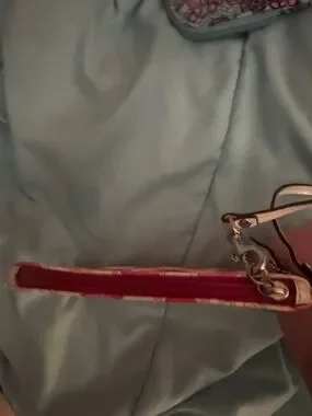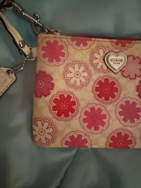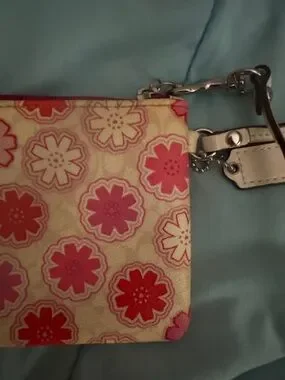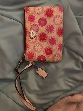 Coach wristlet with pink floral patterns. No flaws or stains. Was used maybe once! **this is NOT big enough to hold a phone** but it is perfect for days you don’t want to bring your purse and just a wallet/wristlet to hold your money and cards and lip gloss, little items! Smoke free home